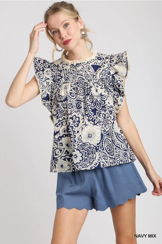 Two Tone Boxy Cut Print Top with Flutter Ruffle Sleeves & Lace Trim Detail